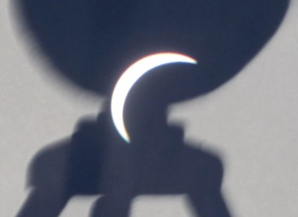 Sen sist så har det ju hunnit vara solförmörkelse, och här uppe ganska mycket, plus att vi hade turen att ha klart väder och kunde beskåda det. Bilden nedan är en projicering via en kikare. Man märkte tydligt att det blev konstigt ljus, typ som att det var skymning mitt på dagen eller att man hade solbrillor på. Jag vet inte om man inbillade sig, men det kändes även extra kyligt en stund…