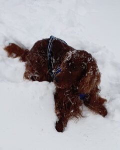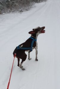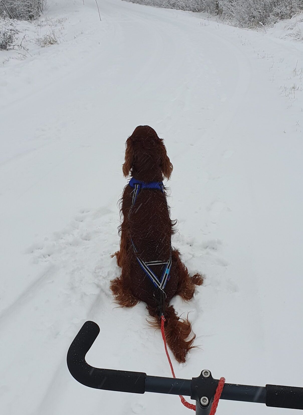 Plötsligt händer det – känns helt overkligt att det var barmark igår eftermiddag och jag körde kickbike med Flash. Idag har vi ca 2 dm snö och jag plockade fram kicksparken #draghund #irländsksetter #scandinavianhound #kickspark