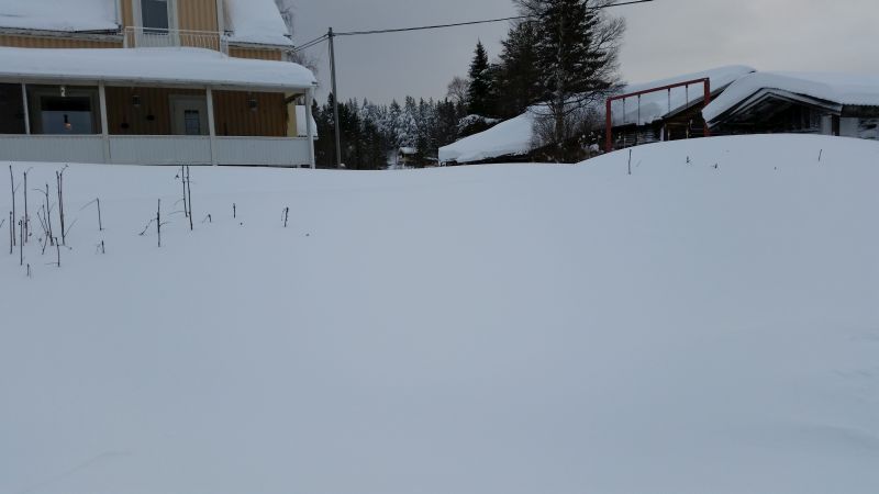 När Rasmus blev som sämst i form var det snöstorm, här var det svårt att se hur mycket det egentligen snöade men runt halvmetern på drygt ett dygn. Det som gjorde det svårt att veta snömängden var att det blåste rätt över gården och byn från älven. Vår ena gång från huset ned mot infarten liksom bara försvann under 1.5 m snö – man kan väl säga att den blåste bort 😉 Den andra gången från huset ned mot garaget skottade vi flera gånger och ändå var det knädjup snö att pulsa genom nästa gång man skulle ut. Stigen runt lägda försvann också under en massa snö och jag tvivlar på att vi trampar upp den något mer denna vinter.